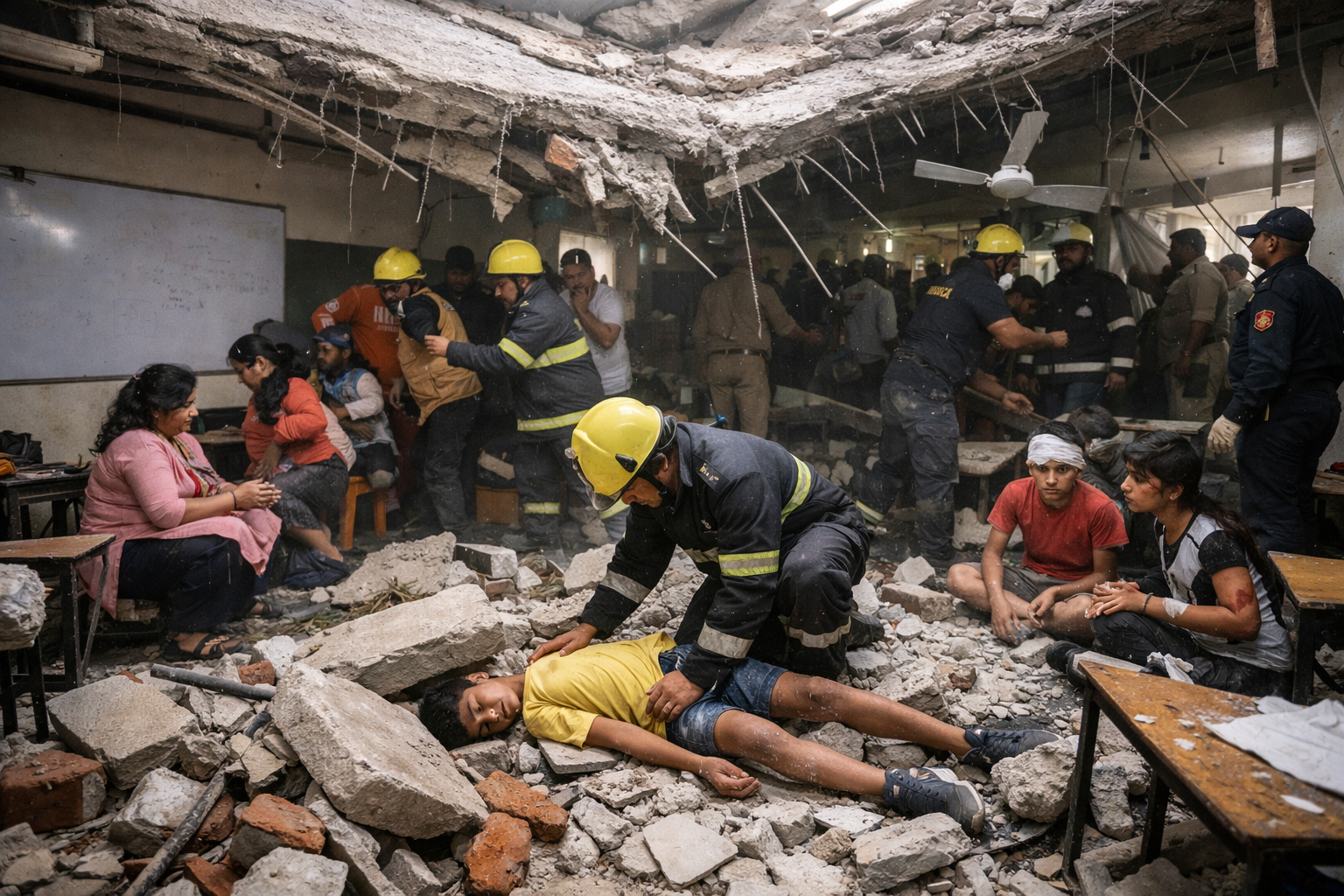 “शिकवणी सुरू असताना अचानक स्लॅब कोसळल्याने विद्यार्थ्यांमध्ये भीतीचे वातावरण निर्माण झाले; स्थानिक नागरिक व बचाव पथकांनी तातडीने मदतकार्य केले.”